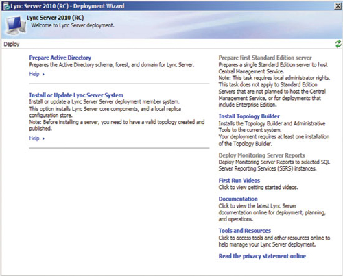 準備好基礎結構并發(fā)布拓撲后,即可開始安裝前端服務器和服務器角色,以啟用 A/V 會議、企業(yè)語音、監(jiān)控、存檔及其他功能。準備每臺服務器從運行部署向導(參見圖 3)開始,但每個服務器角色都有自己的安裝和配置要求。您可以在 TechNet 庫的“部署 Lync Server 2010 Standard Edition”部分查找更多詳細信息。