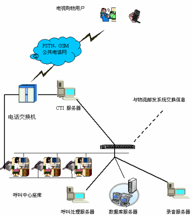電視購物的特點(diǎn)是隨著電視廣告的播出,來訪電話會蜂擁而至,高峰期電話中心系統(tǒng)對大量的電話訪問采用只簡單記錄主要信息,隨后通過CALL BACK進(jìn)行回訪銷售的策略,擴(kuò)大銷售對象。另外電話中心系統(tǒng)對呼損電話自動(dòng)生成CALL