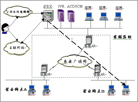 在總部設(shè)立集中的客戶服務(wù)中心完成對全網(wǎng)的人工座席的管理和調(diào)度,由總部的ACD完成對全網(wǎng)人工業(yè)務(wù)的呼叫分配,借助廣域網(wǎng)絡(luò),實(shí)現(xiàn)話務(wù)在區(qū)域范圍內(nèi)的接續(xù)。在座席配置上既可以采用集中配置,各營業(yè)部分散配置專家座席的方式。