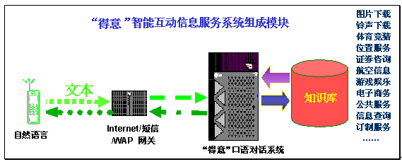 在現(xiàn)有的數(shù)據(jù)通信和信息服務(wù)的技術(shù)平臺(tái)上,加入"得意口語(yǔ)對(duì)話系統(tǒng)運(yùn)行平臺(tái)",就能夠讓用戶在通過(guò)Internet/SMS/WAP等各種通信手段,在電腦、手機(jī)等設(shè)備上以自然語(yǔ)言的形式享受相關(guān)領(lǐng)域的智能互動(dòng)信息服務(wù)。