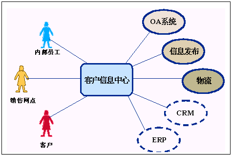 客戶(hù)信息中心有兩個(gè)層次的含義,首先它是一個(gè)信息中心,它應(yīng)該可以訪問(wèn)到后臺(tái)現(xiàn)有的各種系統(tǒng),如OA系統(tǒng)、信息發(fā)布系統(tǒng)、物流系統(tǒng),同時(shí)它還應(yīng)該有良好的擴(kuò)展性,可以和未來(lái)的其它系統(tǒng)相銜接,比如CRM系統(tǒng)、ERP系統(tǒng)相接;其次它是一個(gè)圍繞客戶(hù)的信息中心,它應(yīng)該為客戶(hù)提供方便的信息交流手段,這就要求我們能夠通過(guò)多種媒介實(shí)現(xiàn)信息交互。