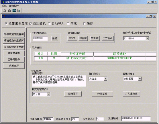 12369環(huán)保熱線系統(tǒng)將接入功能、導(dǎo)航功能、自動(dòng)語音查詢功能、人工座席服務(wù)功能、話路轉(zhuǎn)接功能、信息資料處理緊密聯(lián)系起來。用戶撥打特服電話號碼后,可以根據(jù)需要選擇人工服務(wù)、自動(dòng)語音查詢、自動(dòng)留言,并能夠在幾種服務(wù)中來回切換或轉(zhuǎn)接其它電話;所記錄的資料可以分門別類的進(jìn)行統(tǒng)計(jì)并形成報(bào)表,供相關(guān)部門進(jìn)行檢索查閱;意見處理完畢,可由座席主動(dòng)呼叫用戶,告知處理意見,形成閉環(huán)處理流程。