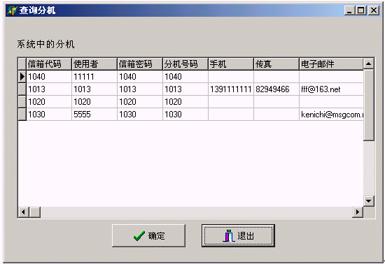 博宇科技自動(dòng)總機(jī)語(yǔ)音信箱系統(tǒng)BYEVMS2.0產(chǎn)品維護(hù)程序用于電話分機(jī)管理、管理員工的語(yǔ)音信箱、Email管理等操作,部分界面如下: