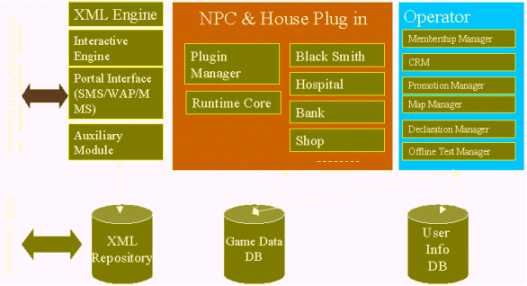 基于上述的因素,北京市萬隆然博科技有限責任公司率先在國內(nèi)推出了無線互連游戲平臺,把游戲的快速開發(fā)、游戲的運行引擎和游戲的客戶服務(wù)管理集成在一體。方便了短訊運營商的運營。同時,然博科技通過分析各類游戲的特點和無線交互方式的特點。具有獨創(chuàng)性的推出了一種游戲描述XML格式。通過然博科技提供的離線工具,游戲策劃人可以自己編寫腳本,自己定義場景,進行仿真。同時,上傳到實際運行的服務(wù)器端。真正的實現(xiàn)了短信門戶的個人創(chuàng)作工具。使得短信門戶真正的可以與傳統(tǒng)的Web門戶有相同的運營模式。ICP可以通過出賣短信服務(wù)器的硬盤空間來實現(xiàn)與內(nèi)容宿主共同盈利的模式。