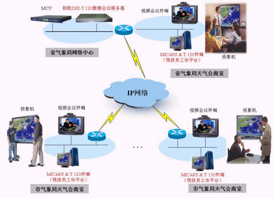 在上圖的應(yīng)用案例中,DSS-T.120數(shù)據(jù)會(huì)議服務(wù)器和MCU通常放置在省氣象局網(wǎng)絡(luò)中心,視頻會(huì)議終端和預(yù)報(bào)員工作平臺(tái)(MICAPS系統(tǒng))放置在各級(jí)氣象部門的天氣會(huì)商室中。在進(jìn)行遠(yuǎn)程可視天氣會(huì)商時(shí),系統(tǒng)通過MCU和視頻會(huì)議終端進(jìn)行視頻、音頻的交互;通過DSS-T.120數(shù)據(jù)會(huì)議服務(wù)器和運(yùn)行在預(yù)報(bào)員工作平臺(tái)上的T.120終端軟件進(jìn)行數(shù)據(jù)的交互,各級(jí)預(yù)報(bào)員在彼此之間看到圖像聽到聲音的同時(shí),可以看到正在做匯報(bào)的預(yù)報(bào)員共享的MICAPS系統(tǒng)中的內(nèi)容,如高空圖、地面圖、云圖等預(yù)報(bào)基礎(chǔ)素材,觀看效果如同在本地會(huì)商室一樣。在本案例中通過T.120數(shù)據(jù)會(huì)議系統(tǒng)與視頻會(huì)議系統(tǒng)的配合,可以進(jìn)行視頻、音頻、數(shù)據(jù)全面的交互,真正實(shí)現(xiàn)了預(yù)報(bào)員之間"面對(duì)面"的交流。