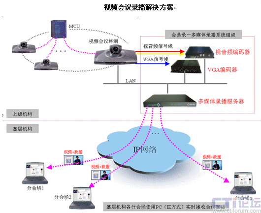 如圖所示,上級機(jī)構(gòu)視音頻編碼器接在視音頻源上,對視音頻信號采集,VGA編碼器采集VGA信號,通過網(wǎng)絡(luò)傳給放在機(jī)房的多媒體錄播服務(wù)器;鶎訖C(jī)構(gòu)的各個(gè)分會(huì)場通過IE瀏覽器的方式接受會(huì)議直播。