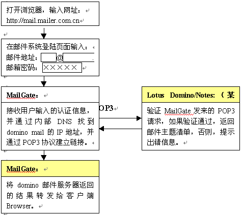 金笛郵件網(wǎng)關(guān)完全基于B/S架構(gòu)的設(shè)計(jì),使得郵件收發(fā)、管理都是基于瀏覽器完成,客戶端只要打開IE瀏覽器即可,無需做任何設(shè)置,大大方便了用戶。也就是說,在城域網(wǎng)任一節(jié)點(diǎn),都可以通過內(nèi)部域名(DNS)訪問郵件網(wǎng)關(guān),然后通過郵件網(wǎng)關(guān)與用戶所在的domino郵件服務(wù)器通訊,將郵件主題、郵件內(nèi)容顯示在web頁(yè)面上。金笛?郵件網(wǎng)關(guān)的具體工作流程如下:
