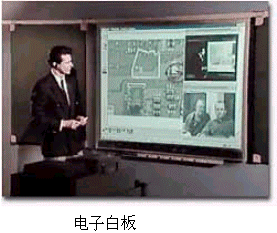 電子白板是經常用來輔助視頻會議數據應用的外設,簡單的講,它是計算機的一個外圍設備或終端,它既可象傳統(tǒng)黑板一樣的使用,又可作為投影儀的幕布,同時它還是一個大型的電腦觸摸屏。電子白板與計算機串口相連,支持Netmeeting軟件,實現白板共享、異地實時互動。響應速度快,分辨率高。