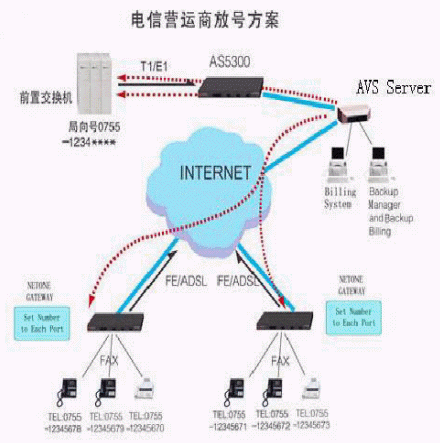 電信運營商放號方案采用寬帶數(shù)據(jù)網(wǎng)絡接入到運營商,IP電話數(shù)據(jù)流通過寬帶數(shù)據(jù)網(wǎng)絡接入運營商的局端網(wǎng)關設備,或者直接進入IP電話網(wǎng)絡。與傳統(tǒng)的電話相比,電信運營商放號方案不需要太多的額外投資購買硬件設備;只需在用戶端安裝NETONE語音網(wǎng)關或IP電話機,話吧、網(wǎng)吧、企業(yè)網(wǎng)用戶、校園網(wǎng)用戶及個人用戶就可以在現(xiàn)有的網(wǎng)絡基礎上實現(xiàn)IP電話放號服務。