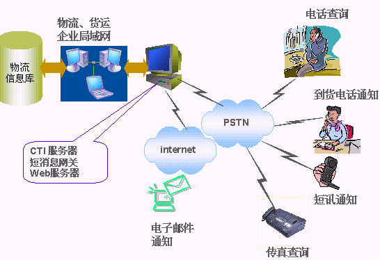 CTI服務(wù)器負(fù)責(zé)接入用戶的查詢請(qǐng)求,并根據(jù)用戶的要求進(jìn)行貨物查詢等操作;根據(jù)企業(yè)預(yù)先設(shè)置的撥號(hào)表逐一外撥到目標(biāo)用戶(貨主或收貨人)完成電話通知的功能。
