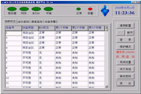 狀態(tài)監(jiān)視:會(huì)議秘書可以監(jiān)視每個(gè)會(huì)議成員的當(dāng)前狀態(tài)。如:空閑、呼叫遇忙、正在振鈴、取機(jī)應(yīng)答、呼入等待、正在通話等狀態(tài)。各種狀態(tài)以不同的顏色顯示在會(huì)議控制臺(tái)上。