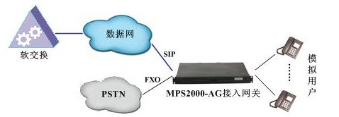 MPS2000-AG接入網(wǎng)關可提供多種接口,如IP接口、FXS、FXO等,使其具有強大的組網(wǎng)能力。其組網(wǎng)如下所示。