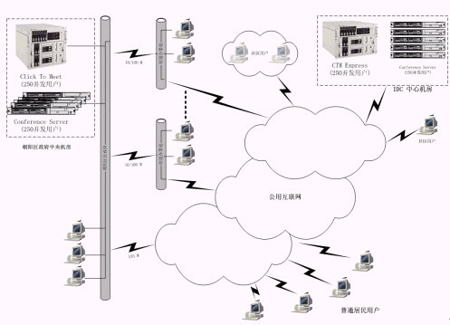 朝陽(yáng)區(qū)政府的中心機(jī)房里放置多臺(tái)FVC公司的Conference Server,實(shí)現(xiàn)支持上千個(gè)并發(fā)用戶的超媒體會(huì)議支撐處理平臺(tái);在中心機(jī)房放置一套完整的超媒體會(huì)議管理系統(tǒng)(Click