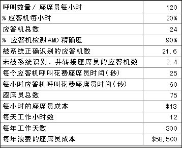 表1和表2表明在一個(gè)呼叫中心中精確的應(yīng)答機(jī)檢測(cè)(AMD)給企業(yè)所帶來的價(jià)值,兩表之間關(guān)于呼叫中心運(yùn)營(yíng)的費(fèi)用每年相差$175,500。那么不同的AMD精確度意味著什么?在上例中,精確度每增加1%意味著每年會(huì)減少約$5,850的損失。