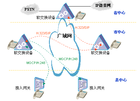 針對這種體系結構,軟交換技術就大有可為了,各地市布置軟交換設備,其間采用H.323/SIP點對點局間協(xié)議,負責各軟交換機之間的通信,在地市到縣區(qū)之間采用MGCP/H.248協(xié)議,這種協(xié)議體系充分吸取了軟交換體系控制與業(yè)務分離的思想,具有高度靈活性,可以兼容PSTN、運營商IP語音網、原有PBX系統(tǒng)等,并且從多方面保障話音質量;管理上由地市軟交換設備對縣區(qū)的接入網關設備進行統(tǒng)一管理,號碼進行統(tǒng)一分配;同時,由地市軟交換設備提供多達數十種增值業(yè)務,可以實現(xiàn)業(yè)務的統(tǒng)一升級,簡單方便。