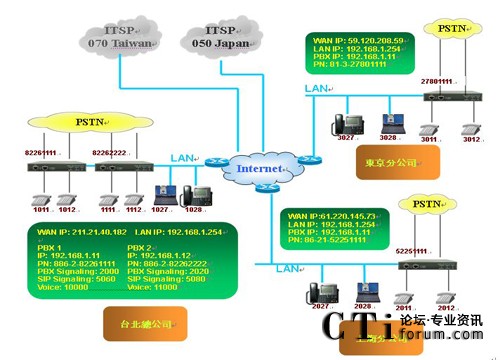 在上圖的架構(gòu)中,各點(diǎn)皆使用MOSA 4604A Plus,皆為2個(gè)FXS、2個(gè)FXO、4個(gè)SIP外線及30個(gè)SIP分機(jī)的型號(hào),F(xiàn)XO接在當(dāng)?shù)氐腜STN(公眾交換電信網(wǎng)絡(luò))上,F(xiàn)XS則接在一般的話(huà)機(jī)上,另各有30的SIP分機(jī)可供其它SIP設(shè)備(如SIP