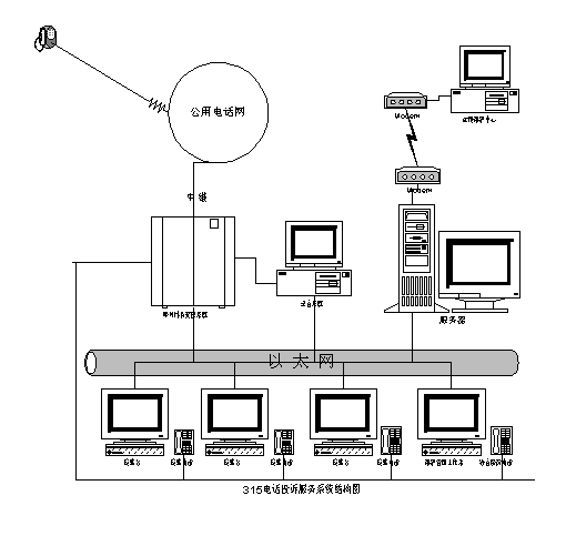 | ZQ-315電話投訴服務(wù)系統(tǒng)由如下各部分組成: 4呼叫排隊(duì)交換系統(tǒng) 4座席臺(tái) 4數(shù)據(jù)庫服務(wù)器 4系統(tǒng)維護(hù)管理臺(tái) 4同步數(shù)字錄音系統(tǒng) 4遠(yuǎn)程通訊模塊 4遠(yuǎn)程維護(hù)終端 各部分通過集線器和五類雙絞線組成快速以太網(wǎng);各節(jié)點(diǎn)之間采用TCPAP協(xié)議,以 Socket方式進(jìn)行通訊。其組成結(jié)構(gòu)如下圖所示。 ![]() 1.呼叫排隊(duì)交換系統(tǒng) 4與公用電話網(wǎng)相連,將來話分配到座席臺(tái)或遇忙排隊(duì) 4自動(dòng)應(yīng)答來話,完成自動(dòng)受理投訴與自動(dòng)查詢服務(wù) 4進(jìn)行呼叫轉(zhuǎn)移 2.座席臺(tái) 4人工應(yīng)答來話 4顯示主叫號(hào)碼、戶主與地址等信息(根據(jù)需要) 4計(jì)算機(jī)輔助投訴受理 4計(jì)算機(jī)輔助業(yè)務(wù)咨詢(法律。個(gè)案等) 3.?dāng)?shù)據(jù)庫服務(wù)器 4運(yùn)行網(wǎng)絡(luò)操作系統(tǒng) 4運(yùn)行數(shù)據(jù)庫系統(tǒng) 4提供各種數(shù)據(jù)服務(wù) 4對網(wǎng)絡(luò)安全性進(jìn)行檢查控制 4.系統(tǒng)維護(hù)管理臺(tái) 4對數(shù)據(jù)庫進(jìn)行維護(hù)管理 4查詢各種業(yè)務(wù)數(shù)據(jù),生成統(tǒng)計(jì)報(bào)表。 5.同步數(shù)字錄音系統(tǒng) 4將模擬話音轉(zhuǎn)換成數(shù)字信號(hào),并壓縮存儲(chǔ)。多路錄音,互不干擾 4支持多種語音數(shù)據(jù)壓縮格式(如PCMchDPCM、WAV等) 4播放放音 6.遠(yuǎn)程通訊模塊 4與上級(jí)或遠(yuǎn)程系統(tǒng)進(jìn)行通訊。 7.遠(yuǎn)程維護(hù)終端 4遠(yuǎn)程撥號(hào)登陸系統(tǒng),對系統(tǒng)進(jìn)行全面維護(hù) |
