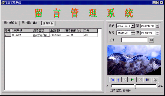 當(dāng)系統(tǒng)中無話務(wù)員登錄或等待超過20秒,則進入語音信箱服務(wù)。語音信箱在進入時提示用戶:“系統(tǒng)正忙,請留下您的聯(lián)系電話,復(fù)本機號請掛機,復(fù)其他號碼請輸入電話號碼,按‘#’號鍵結(jié)束,或者在聽到‘嘟’的一聲之后留下你的留言”,當(dāng)主叫號碼位數(shù)不夠7位時,提示:“系統(tǒng)正忙,請輸入您的聯(lián)系電話,按‘#’號鍵結(jié)束,或者在聽到‘嘟’的一聲之后留下你的留言”,系統(tǒng)將客戶留下的電話號碼記錄到數(shù)據(jù)庫中。將留言存放到一個指定目錄中,用話務(wù)號作為語音文件名。