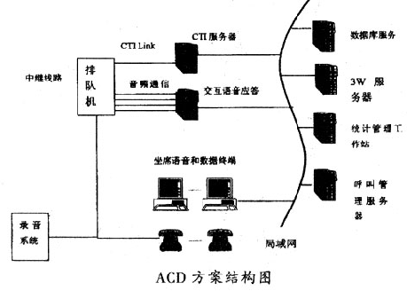 這種方案的核心思想是在專用交換機+ACD的基礎上擴展路由和統(tǒng)計的功能,開放CTI -Link接口,用CTI技術實現(xiàn)通信和計算機的功能結合,再配以必要的語音和數(shù)據庫系統(tǒng),從而以強大的通信和計算機功能滿足呼叫中心的要求。