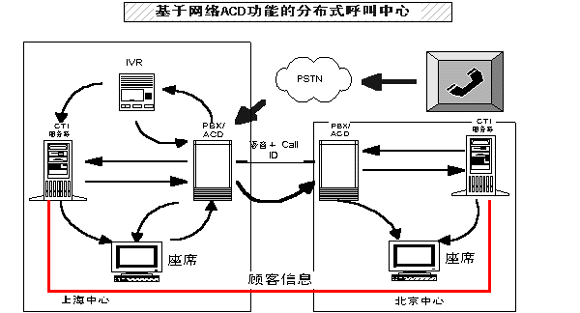 采用智能呼叫分配(ACD),由多種條件決定路由的選擇,如業(yè)務員的忙閑統(tǒng)計、業(yè)務員的服務能力、每天不同時段呼叫統(tǒng)計、主叫用戶的所在區(qū)域以及主叫用戶的號碼等。企業(yè)呼叫中心甚至可突破語言界限,跨越不同電話系統(tǒng)網絡分布到全球轉發(fā)話音及數(shù)據。