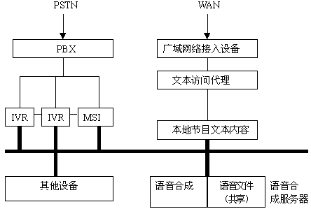 離線合成可以與省級(jí)甚至全國(guó)聲訊網(wǎng)絡(luò)結(jié)合,開發(fā)出靈活的聯(lián)網(wǎng)業(yè)務(wù)。即文本訪問代理從廣域網(wǎng)上取得節(jié)目文本數(shù)據(jù)存放于本地的文本數(shù)據(jù)共享目錄,語音合成服務(wù)器通過訪問該目錄獲取節(jié)目文本合成為語音文件存放與服務(wù)器的語音文件共享目錄中。局域網(wǎng)內(nèi)其他設(shè)備(IVR、MSI等等)訪問語音文件共享目錄,向用戶播放最新生成的語音信息。