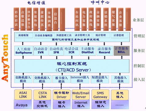 佳訊飛鴻近十年來一直致力于建設(shè)國內(nèi)一流的呼叫中心系統(tǒng)和電信增值業(yè)務(wù),其CTI方面的主打產(chǎn)品AnyTouch平臺廣泛應(yīng)用到電信、鐵路、軍隊(duì)、郵政、媒體、政府、電力、金融和商業(yè)等多個行業(yè)的呼叫中心、客服中心、CRM、電子商務(wù)和信息化平臺項(xiàng)目建設(shè)中。AnyTouch平臺是融合呼叫中心和電信增值業(yè)務(wù)的CTI應(yīng)用產(chǎn)品,是一個綜合的、集成的開發(fā)工具。她能夠構(gòu)建各種熱線電話系統(tǒng)、客戶服務(wù)系統(tǒng)、企業(yè)服務(wù)中心等呼叫中心業(yè)務(wù);同時可生成彩話、點(diǎn)歌、固話秘書臺、信息臺等電信增值業(yè)務(wù)。