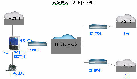 遠(yuǎn)端接入:根據(jù)實(shí)際遠(yuǎn)端中繼數(shù)量,選擇IP MUX4/8/16網(wǎng)關(guān),通過環(huán)路中繼接口連接本地的電信網(wǎng);