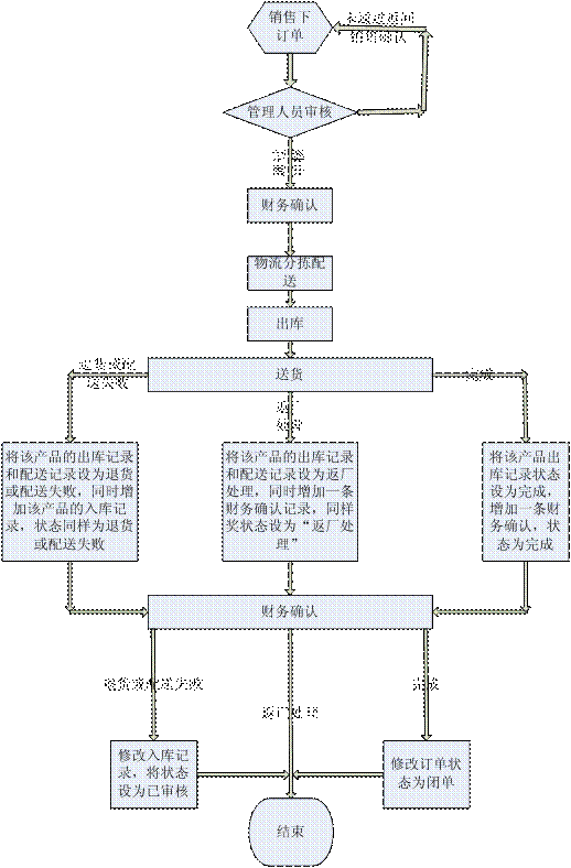 在呼叫中心系統(tǒng)中,為了更好地幫助企業(yè)進行銷售管理,UltraCRM系統(tǒng)設(shè)有進銷存管理。從產(chǎn)品的采購、入庫出庫、退貨、返廠處理、庫存管理、庫存盤點到財務(wù)確認都有一套完整的流程。參見圖7.22和7.23的產(chǎn)品入庫流程和出庫流程。所有在呼叫中心中進行銷售的產(chǎn)品數(shù)據(jù)都分類保存在系統(tǒng)的數(shù)據(jù)庫中,坐席人員可以根據(jù)產(chǎn)品型號、名稱、關(guān)鍵字等進行分類查詢。各類產(chǎn)品的基本參數(shù)、介紹也都包含在產(chǎn)品數(shù)據(jù)庫中,坐席人員可以很快地查到一項產(chǎn)品的基本信息,提高與用戶溝通的工作效率。