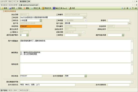 3) 工作流閉環(huán)、客戶通話歷史,客戶聯(lián)系歷史,工單流轉(zhuǎn):工作流系統(tǒng)是通過工單實現(xiàn)各工作流環(huán)節(jié)的聯(lián)系以及工作流的定義管理,工作流狀態(tài)查詢、更改的。操作員可根據(jù)用戶的不同業(yè)務(wù)請求,建立相應(yīng)的工單記錄,并對該事后處理過程進行跟蹤;也可對要處理的事務(wù)形成工單轉(zhuǎn)給相應(yīng)的操作員,并跟蹤該工單的處理過程;可定期提示操作員處理要過期的工單,以提高服務(wù)質(zhì)量;每次處理過程都會有詳細的記錄,以便統(tǒng)計查詢 。如圖8、9、10: