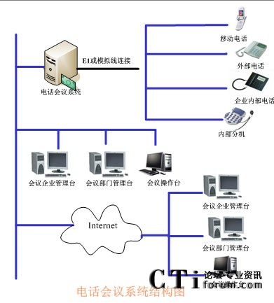 TalenTel CNF電話會(huì)議系統(tǒng)可以與程控交換機(jī)配合使用,也可以直接與局方的系統(tǒng)進(jìn)行連接,系統(tǒng)的構(gòu)成含如下幾部分:TalenTel CNF電話會(huì)議系統(tǒng)服務(wù)器(ctsIVR)、會(huì)議企業(yè)管理員模塊、會(huì)議部門管理員模塊、會(huì)議操作員管理模塊、數(shù)據(jù)庫(kù)等組成。