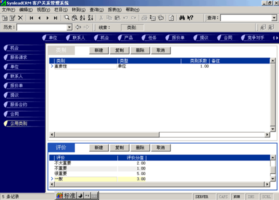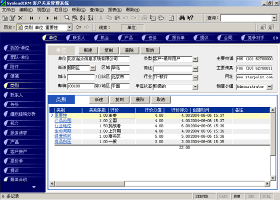 客戶單位的分類較聯系人的分類更復雜。常用的分類有:按照企業(yè)規(guī)模來分類(大、中、小,層次自定義,下同)、按照該客戶與本單位的緊密程度分類(緊密、普通、疏遠)、按照該客戶的重要性分類(重要、普通、次要)、按照該客戶的忠誠度分類(忠誠、普通、游移)。有一些用戶企業(yè),希望對客戶單位特征進行采集,進而進行客戶信用評價。信用特征的類別可以多達數十種類(詳細情況可參考有關書籍)。利用SynleadCRM,您可以為每個類指定系數,為類下屬的每個評價指定評分分值。例如,您可以建立一個類別為"客戶倉庫積壓商品的情況",系數為1,該類別下屬的評價有"很多1分"、"一般3分"、"少1分"、"未知0分",如果指定某客戶該類別的評價為一般,則該項目得分為3分*1(系數)=3分。依此類推,您還可以指定更多的分類與評價,例如:客戶經營場所所處的位置、客戶在企業(yè)生命周期中所處的位置、客戶在行業(yè)中的地位、客戶產品的組合情況、客戶產品覆蓋的市場范圍、客戶產品的淡旺季規(guī)律、客戶近年營業(yè)額的增減趨勢、客戶的年度營業(yè)額、客戶的現金周轉能力、客戶的負債情況、客戶是否涉及中大訴訟等。每一個類別項目的評分經過系數的加權運算后,可以求和,得到這個客戶的總評分。未來也可以利用分析模型對此類數據進行進一步的分析,提供輔助決策所需要的圖表和報表。
