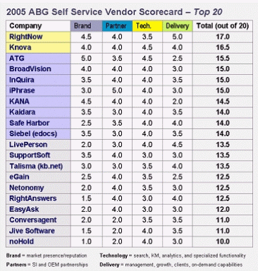 著名企業(yè)咨詢公司ABG(Allen Bonde Group )近日對著名自助服務軟件制造商進行了綜合評估。此次評估綜合考慮廠商在四個類別中的表現(xiàn):品牌、合作伙伴、技術(shù)水平、實施。綜合評估滿分為20分。