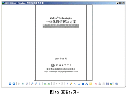 用戶可以顯示、保存、移動、刪除、復制傳真,也可以回撥傳真來電號碼。選擇顯示傳真時,系統(tǒng)自動調用圖片處理軟件打開傳真(不同的操作系統(tǒng)軟件或版本所帶軟件不同,下圖僅供參考)。