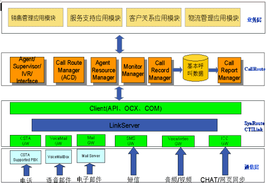 。。CallRoute平臺(tái)是一個(gè)基于CSTA標(biāo)準(zhǔn)、支持分布互連的呼叫中心平臺(tái)。商路通呼叫中心平臺(tái)全套產(chǎn)品包括多個(gè)服務(wù)部件,客戶端的接口部件(OCX、DLL)以及功能豐富應(yīng)用工具。我們的軟件系統(tǒng)采用先進(jìn)的軟件工程設(shè)計(jì)方法,整個(gè)系統(tǒng)的軟件結(jié)構(gòu)體系遵循以下設(shè)計(jì)原則: