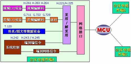 如圖所示:視頻會議終端將輸入進來的視頻使用H.261、H.263或H.264協(xié)議、音頻使用G.711、G.722或G.728、數(shù)據(jù)、控制信令進行單獨編碼,然后將編碼后的數(shù)據(jù)進行“復(fù)用”打包后形成遵循網(wǎng)絡(luò)協(xié)議的數(shù)據(jù)包,通過網(wǎng)絡(luò)接口傳到MCU供選擇廣播。從MCU傳來的其他會場的數(shù)據(jù)包通過“解復(fù)用”,分別還原成視頻、音頻以及數(shù)據(jù)及控制信令分別相應(yīng)的輸出設(shè)備上回顯或執(zhí)行。