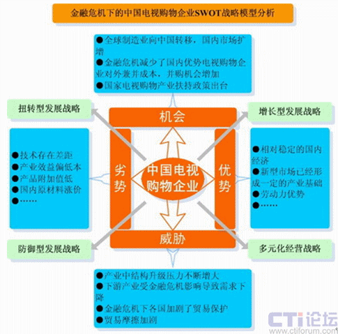 1992年至2009年以來,電視購(gòu)物經(jīng)歷了從割據(jù)到統(tǒng)一,全國(guó)購(gòu)物頻道網(wǎng)絡(luò)化;從粗放到科學(xué),頻道運(yùn)營(yíng)模式專業(yè)化;從簡(jiǎn)介到深度,頻道編排方式規(guī)律化、從滯后到及時(shí),物流配送體系成熟化。電視購(gòu)物被譽(yù)為繼零售、超市之后的第三次銷售革命,電視購(gòu)物將成為金融危機(jī)經(jīng)濟(jì)形態(tài)下未來中國(guó)電視新的經(jīng)濟(jì)增長(zhǎng)點(diǎn),而付費(fèi)電視、數(shù)字網(wǎng)絡(luò)電視的發(fā)展,是中國(guó)電視購(gòu)物市場(chǎng)新的戰(zhàn)略機(jī)會(huì)。金融危機(jī)下的中國(guó)電視購(gòu)物企業(yè)SWOT戰(zhàn)略模型分析如下: