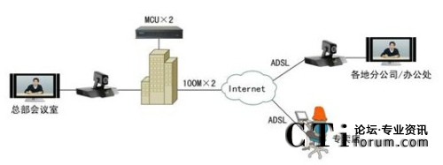 整個(gè)方案在部署上極其簡單,紅豆集團(tuán)總部架設(shè)一臺(tái)KDV8000C多點(diǎn)控制單元和一臺(tái)KDV8000E多點(diǎn)控制單元,全國各地分公司/辦事處的會(huì)議室各部署一套TrueSens硬件視頻會(huì)議終端,而遍布全國的紅豆男裝專賣店、軒帝尼專賣店內(nèi)則分別部署一套科達(dá)軟件視頻會(huì)議終端。集團(tuán)總部采用電信、聯(lián)通的百兆寬帶各一條,各地的分支機(jī)構(gòu)和專賣店則均通過普通的ADSL接入。系統(tǒng)拓?fù)鋱D如下: