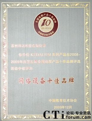 CTI論壇(ctiforum)12月14日消息(記者 張塵):2009年12月4日,由國內(nèi)教育權(quán)威機(jī)構(gòu)“中國教育技術(shù)協(xié)會”主辦,以讀者調(diào)查問卷的形式舉行的第五屆全國電教產(chǎn)品十佳品牌頒獎典禮在福州梅峰賓館盛大開幕,科達(dá)教育視頻會議產(chǎn)品憑借卓越的產(chǎn)品性能和良好的客戶服務(wù)入選網(wǎng)絡(luò)產(chǎn)品類十佳之列,同時(shí)也成為首個(gè)入選十佳品牌的視頻會議產(chǎn)品。