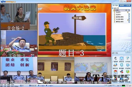 本次架設(shè)的空軍大比武平臺(tái),滿足了總部主持指揮協(xié)調(diào)和各二級(jí)部參加比賽的應(yīng)用?偛颗c各二級(jí)部分別架設(shè)網(wǎng)動(dòng)視頻會(huì)議硬件終端,分會(huì)場(chǎng)觀眾通過(guò)登錄網(wǎng)動(dòng)統(tǒng)一通信平臺(tái)Active UC®觀看實(shí)時(shí)比賽畫面,并與現(xiàn)場(chǎng)互動(dòng)、點(diǎn)評(píng)?偛恐鞒秩丝晒蚕韰①惒块T的答題桌面,把答題結(jié)果展現(xiàn)給評(píng)委和各會(huì)場(chǎng)觀眾。系統(tǒng)可實(shí)現(xiàn)舉手搶答,答題結(jié)果實(shí)時(shí)上傳等貼心功能。
