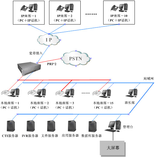 RT-CCP1000還有100M以太網(wǎng)接口,通過(guò)這個(gè)接口可以把RT-CCP1000連接到Internet上。每個(gè)IP座席配備VOIP終端(IP電話(huà)、軟電話(huà)或IAD)和電腦各一臺(tái),VOIP終端把Proxy地址指向RT-CCP1000,電腦上安裝座席客戶(hù)端軟件,都通過(guò)Internet接入中心系統(tǒng)。