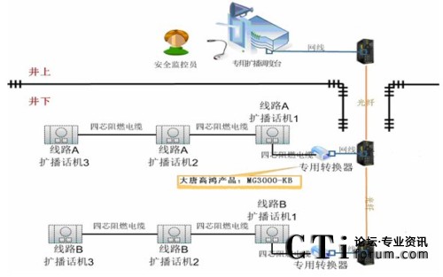 系統(tǒng)采用全分布式控制結(jié)構(gòu)。主要由專(zhuān)用防爆轉(zhuǎn)換器(MG3000-KB)、防爆擴(kuò)播電話(huà)機(jī)、隔爆兼本安型電源和專(zhuān)用擴(kuò)播調(diào)度臺(tái)構(gòu)成。專(zhuān)用擴(kuò)播調(diào)度臺(tái)位于地面中央控制室,專(zhuān)用擴(kuò)播調(diào)度臺(tái)與專(zhuān)用轉(zhuǎn)換器之間采用工業(yè)以太網(wǎng)絡(luò)連接,專(zhuān)用防爆轉(zhuǎn)換器與防爆擴(kuò)播電話(huà)機(jī)之間采用總線(xiàn)結(jié)構(gòu)聯(lián)接。