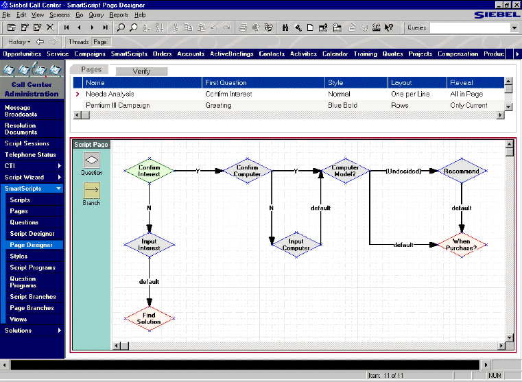 Siebel eMarketing能夠使企業(yè)創(chuàng)建、執(zhí)行、評估其基于Web的市場營銷策略。利用Siebel eMarketing ,市場營銷人員可以對客戶信息進行綜合的分析與預測,對市場營銷策略和投資回報預期進行評估,并且能夠創(chuàng)建圖形化的統(tǒng)計分析,如圖三所示;能夠自動生成基于Web-Email的客戶交流機會并進行適當?shù)拇黉N行動。Siebel eMarketing還可以為客戶提供人性化的主頁設計;進行個性化的Web促銷;基于客戶檔案信息進行新產(chǎn)品的直接或交叉推薦;同時還提供到Siebel eSales的超級聯(lián)接,當客戶對某種產(chǎn)品感興趣時,Siebel eMarketing可直接引導其聯(lián)接到Siebel eSales上。另外,企業(yè)營銷策略的設計者通過使用Siebel eSmartScript工具可以定制在線的客戶滿意度調(diào)查,同時還可以進行可視化的營銷策略工作流的設計。如圖四所示。