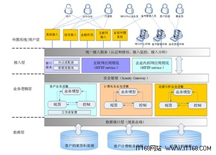 其中,外圍系統(tǒng)/用戶層主要指系統(tǒng)相關(guān)的外圍系統(tǒng),以及業(yè)務(wù)受理、系統(tǒng)管理、綜合查詢、繳費(fèi)、統(tǒng)計(jì)報(bào)表、帳務(wù)管理等與客戶或操作人員交互的應(yīng)用系統(tǒng)界面。接入層為最終客戶提供統(tǒng)一的客戶接觸、服務(wù)平臺(tái),為各個(gè)營(yíng)銷渠道服務(wù)人員提供良好的工作平臺(tái),支撐其為客戶提供優(yōu)質(zhì)服務(wù),同時(shí)為其它外圍系統(tǒng)和機(jī)構(gòu)提供實(shí)時(shí)、定時(shí)批處理接口。業(yè)務(wù)邏輯層(應(yīng)用層)是系統(tǒng)的最核心部分,它接收來(lái)自表現(xiàn)層的功能請(qǐng)求,是實(shí)現(xiàn)各種業(yè)務(wù)功能的邏輯實(shí)體,如業(yè)務(wù)受理中的業(yè)務(wù)新裝、開/停機(jī)、業(yè)務(wù)變更以及話費(fèi)查詢、報(bào)表統(tǒng)計(jì)計(jì)算等。數(shù)據(jù)層用于存放并管理各種系統(tǒng)數(shù)據(jù),如客戶資料數(shù)據(jù)、資源數(shù)據(jù)、銷售數(shù)據(jù)、統(tǒng)計(jì)分析數(shù)據(jù)等。