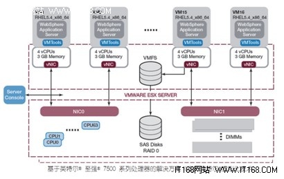 另外,由于電信行業(yè)的特殊性,許多舊的應(yīng)用無(wú)法快速有效的部署在新平臺(tái)下,造成服務(wù)器利用低,服務(wù)器的數(shù)量越來(lái)越多的問題,為此,英特爾與東軟也從幾年前開始進(jìn)行密切合作,在早期的英特爾至強(qiáng)7300、至強(qiáng)7400、至強(qiáng)7500等一系列四路高端服務(wù)器平臺(tái)上搭建了虛擬化解決方案,使過去電信舊的應(yīng)用能夠很快在新平臺(tái)上進(jìn)行部署。下圖顯示的是東軟以兩臺(tái)基于英特爾至強(qiáng) 7500 系列處理器的四路服務(wù)器為基礎(chǔ),構(gòu)建了整個(gè) BSS 架構(gòu):