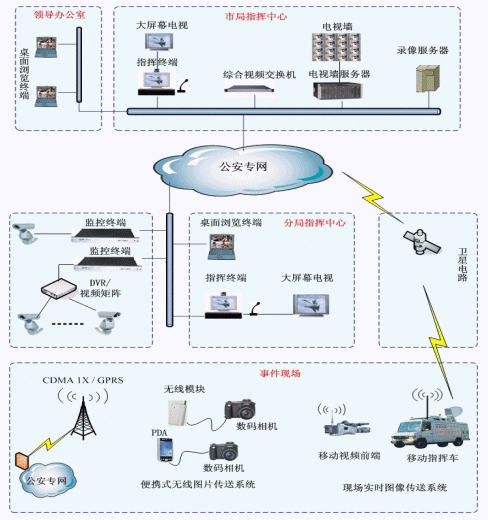 系統(tǒng)分3個層次,市局指揮中心、區(qū)縣分局(交警、消防)指揮中心、移動指揮終端(現(xiàn)場指揮中心),主要設(shè)備包括:綜合視頻交換機、指揮終端、監(jiān)控終端、電視墻服務(wù)器、存儲錄像服務(wù)器、瀏覽終端、移動視頻前端、搞清晰圖片傳輸系統(tǒng)等。系統(tǒng)結(jié)構(gòu)如圖示。