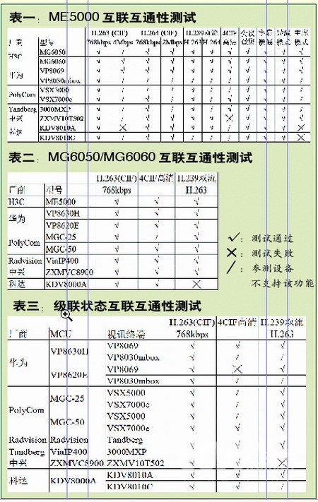 眼見(jiàn)為實(shí),為了驗(yàn)證H3C視訊產(chǎn)品的互聯(lián)互通性,我們對(duì)其進(jìn)行了實(shí)際測(cè)試。互聯(lián)互通性屬應(yīng)用級(jí)特性,測(cè)試起來(lái)并不困難,但有些煩瑣。由于視訊系統(tǒng)核心組件通常包括MCU和視訊終端兩類設(shè)備,兼容性互有交叉,因此我們將測(cè)試分成3組進(jìn)行。參與測(cè)試的設(shè)備除H3C的MCU(多點(diǎn)控制單元)ME5000和視訊終端MG6050/MG6060外,還包括其它5個(gè)廠商的7款MCU和8款視訊終端。