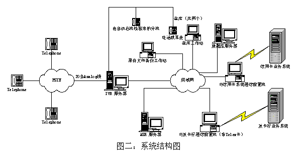 在硬件上系統(tǒng)由語音識別服務(wù)器、IVR服務(wù)器(含語音卡、坐席卡)、數(shù)據(jù)庫服務(wù)器、與發(fā)卡行業(yè)務(wù)系統(tǒng)通信前置機(含Telex卡)、與信用卡網(wǎng)絡(luò)系統(tǒng)通信前置機、坐席用工作站、錄音文件備份工作站以及相應(yīng)的連接設(shè)備組成。
