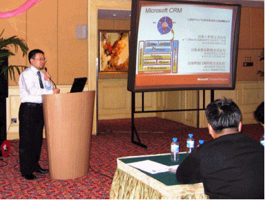 微軟公司負(fù)責(zé)天津地區(qū)的夏玉玲小姐在簡(jiǎn)短的開幕式后首先發(fā)表演講,介紹了微軟為商業(yè)應(yīng)用開發(fā)的各種商務(wù)解決方案(MBS)。其后通用咨詢公司總經(jīng)理鄭明先生上臺(tái)演說,其演講主題將營(yíng)銷管理理論體系與微軟CRM密切結(jié)合,博得了與會(huì)者贊同的掌聲。