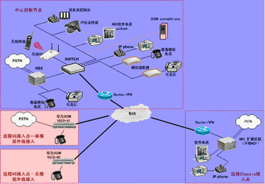 IPPBX將成為企業(yè)辦公不可缺少的一部分。此方案適合于已經(jīng)有PBX的公司,由于先期已經(jīng)投入了PBX設備,費用昂貴,所以不會輕易被替換。在外地有多家分公司,使用傳統(tǒng)電話通訊費用很高,希望能降低成本。并希望在分公司所在城市可以通過當?shù)氐腜STN落地,節(jié)省長途費用。依照客戶的需求,我們制定了以下方案: