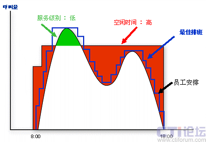 如果僅僅是工作量大,我想排班員還能夠忍受,更要命的是,排出的班表不能做到精確。要么人員太多,導(dǎo)致運(yùn)營成本上升;要么人員不夠,無法達(dá)到預(yù)期的服務(wù)目標(biāo)。以呼叫中心典型的雙峰曲線為例(如右圖),排班所追求的是人力安排和話務(wù)曲線的盡可能吻合(也就是圖中藍(lán)色的最佳排班線),達(dá)到在滿足服務(wù)水平的基礎(chǔ)上盡可能少的安排座席資源。而在手工排班中,由于大量的采用組排班,組中成員同時(shí)上下班、同時(shí)午餐,導(dǎo)致人力安排的靈活性降低,不能盡可能的去擬合話務(wù)曲線。此外,參考前面談到的影響人力安排的因素,手工排班中考慮了環(huán)境的影響,部分考慮了縮減,但座席技能因素考慮很少,基本認(rèn)為所有人員的技能熟練度一致,不可預(yù)見性縮減也沒有考慮進(jìn)去,導(dǎo)致最終會(huì)對服務(wù)水平造成負(fù)面影響。因此,手工排班是一種粗放型的排班方式,隨著運(yùn)營要求的提高,表現(xiàn)出一定的不適應(yīng)性。